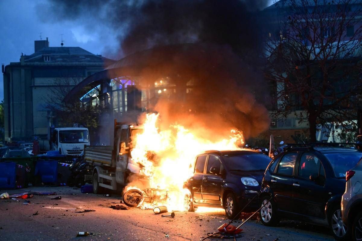 Nel caos degli scontri, un furgone e uno scooter hanno preso fuoco.